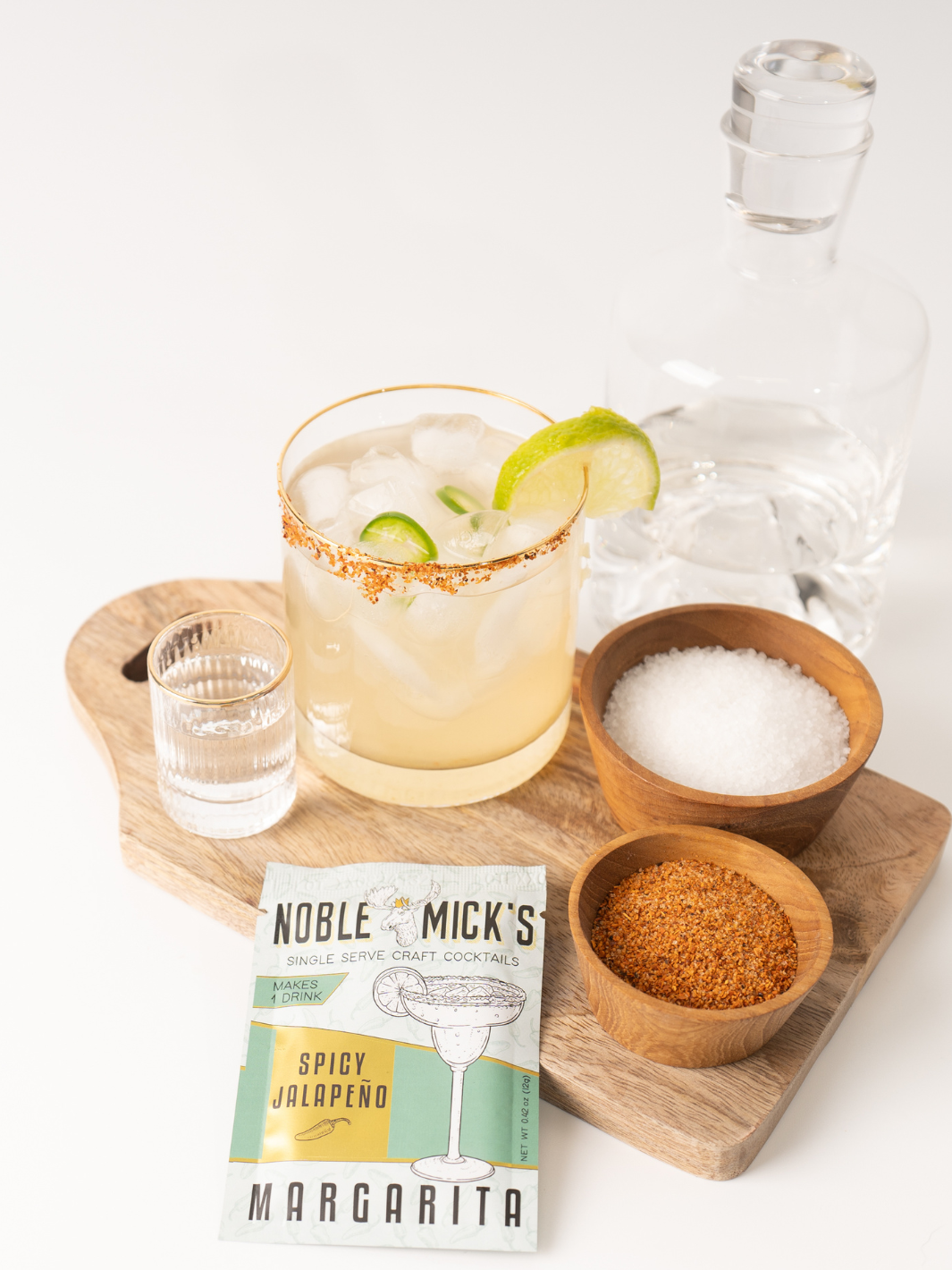 This bright, spicy, and citrusy blend makes the perfect Spicy Jalapeño Margarita. To craft your cocktail, start with a cocktail mixer, add 2 ounces of your favorite tequila, 2 ounces of water, the Noble Mick's Margarita mix and fill the mixer with ice. Shake well to break down the ice and marry the ingredients. Before filling your favorite rocks or margarita glass, we recommend using a lime to flavor the rim of the glass and dipping it in course sea salt or Tajín Clásico Seasoning. Add ice and pour contents from mixer into the glass. For garnish add a jalapeño slice or two and a lime wedge.