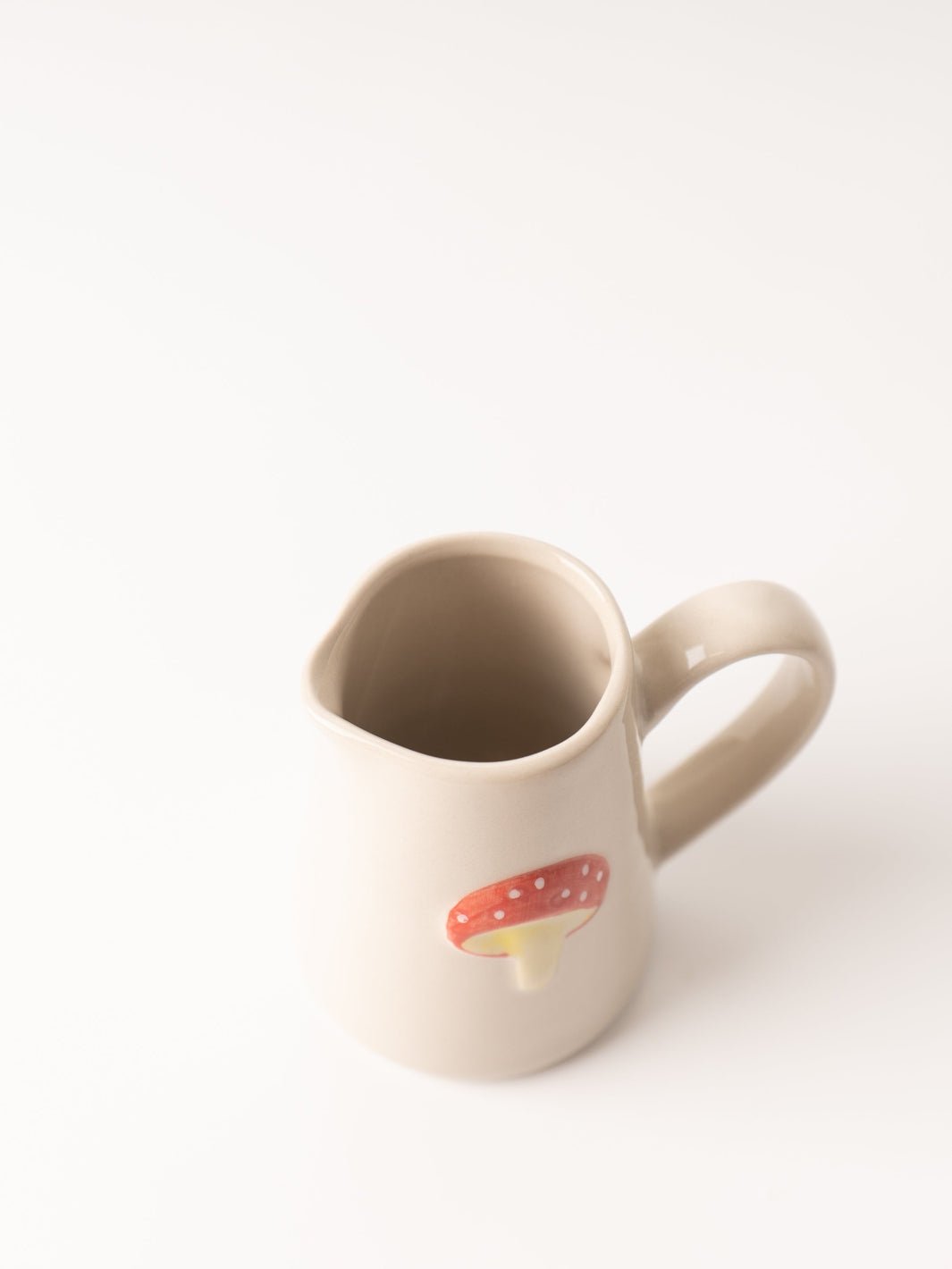 Infuse your table with a touch of woodland flair with this Mini Mushroom Creamer, where whimsical cottagecore meets modern design. Crafted from smooth ivory stoneware and accented with a playful red mushroom, this petite creamer is perfect for serving cream, milk, or syrup with a touch of enchantment.