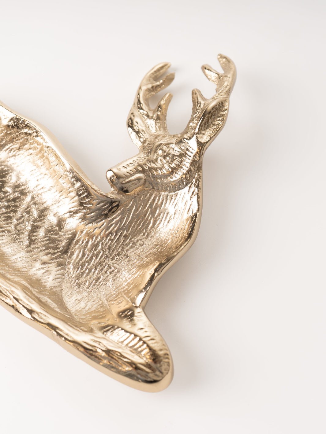 Inspired by woodland beauty, this cast aluminum dish features a reclining deer with a warm, gold finish and gently worn details. Ideal for holding small keepsakes, it lends a touch of rustic outdoor to entryways, tables, or dressers.Â
