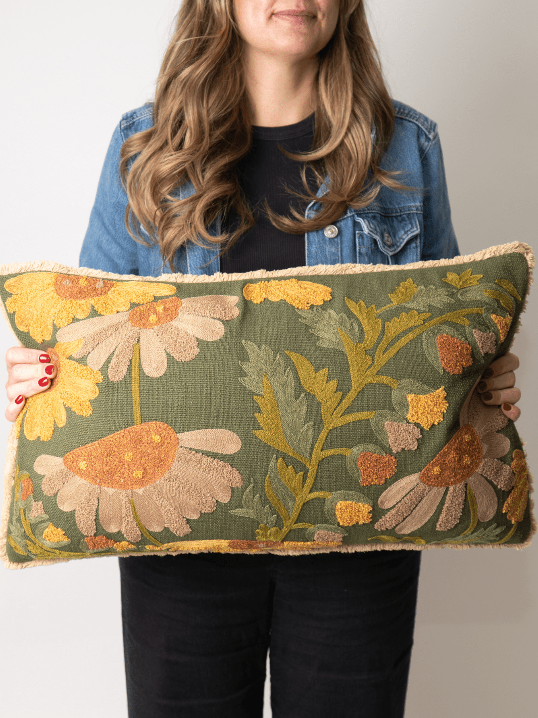 Enhance your autumn decor with this beautifully embroidered Fall Floral Cotton Slub Pillow, featuring delicate fringe details and a soft chambray back for added style and comfort.