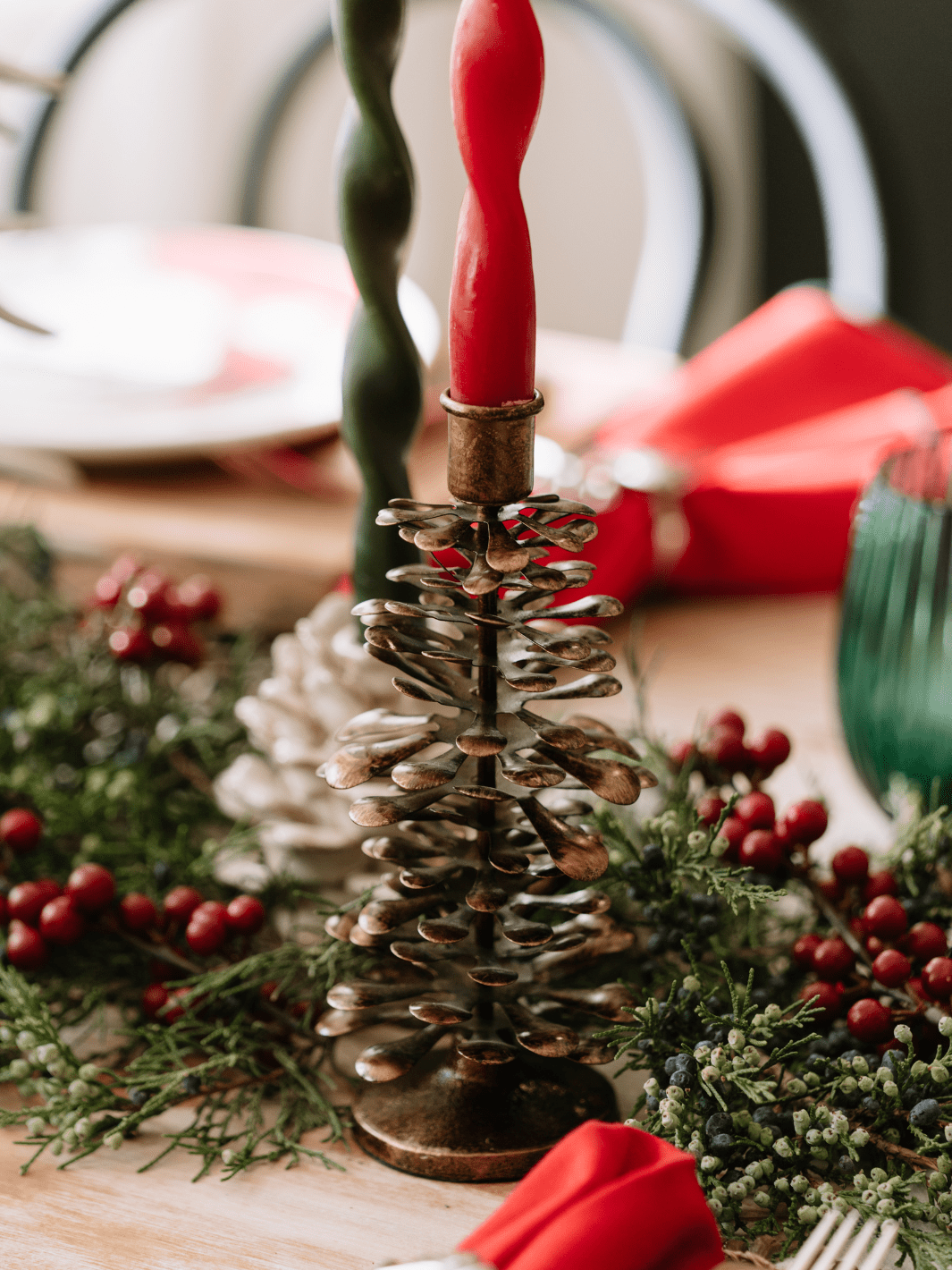 Infuse your space with rustic warmth using the Medium Metal Pinecone Taper Holder, an ideal piece for transitioning your decor from fall to winter. Whether displayed on a shelf, mantel, or table, this timeless taper holder adds a cozy, seasonal touch to your gatherings.