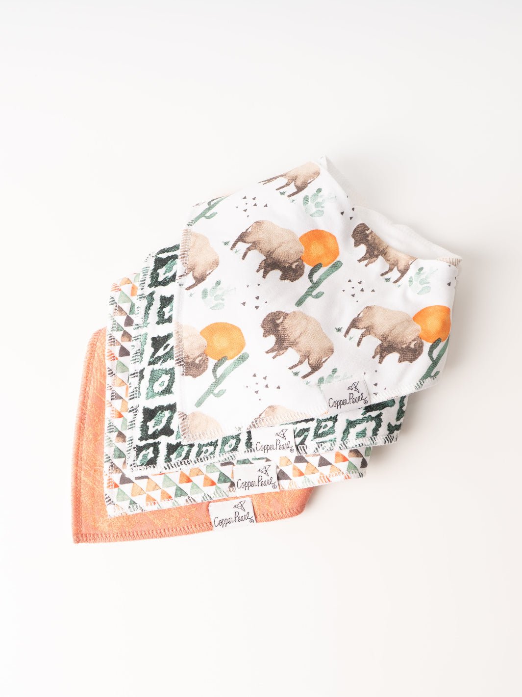 Keep your little one's clothes protected with this Bison Bandana Bib Set. This set of four features a charming bison-themed print with geometric designs. Crafted from ultra-soft cotton and backed with warm fleece for superior absorbency and comfort. The adjustable snap closure ensures a secure fit as your baby grows—making these bibs a must-have accessory during the teething and drooling phase.