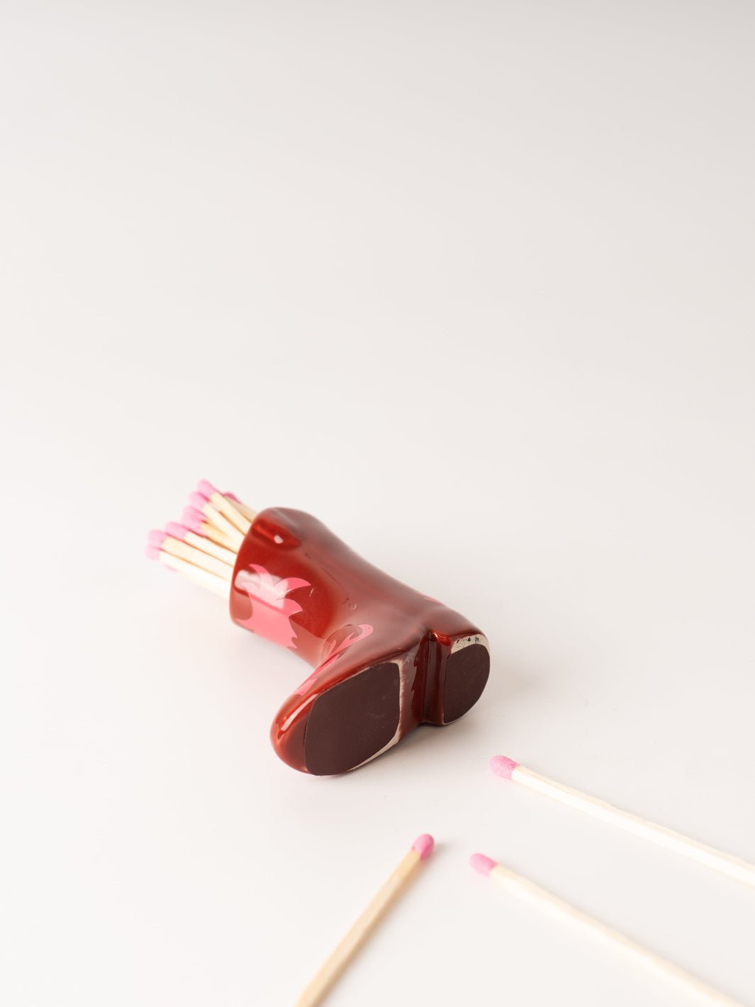 Includes 25 colorful safety matches with ceramic cowboy boot match holder.